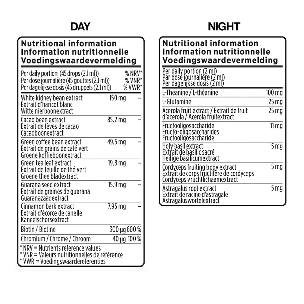 Day Drops: Water, humectants (glycerol), white kidney bean extract (Phaseolus vulgaris), sweetener (erythritol), cocoa bean extract (Theobroma cacao), natural flavouring, green coffee bean extract (Coffea arabica), acidity regulator (citric acid), green tea leaf extract (Camellia sinensis), guarana seed extract (Paullinia cupana), cinnamon bark extract (Cinnamomum cassia), preservative (potassium sorbate), D-biotin, chromium (III) chloride, sweetener (steviol glycosides from stevia).